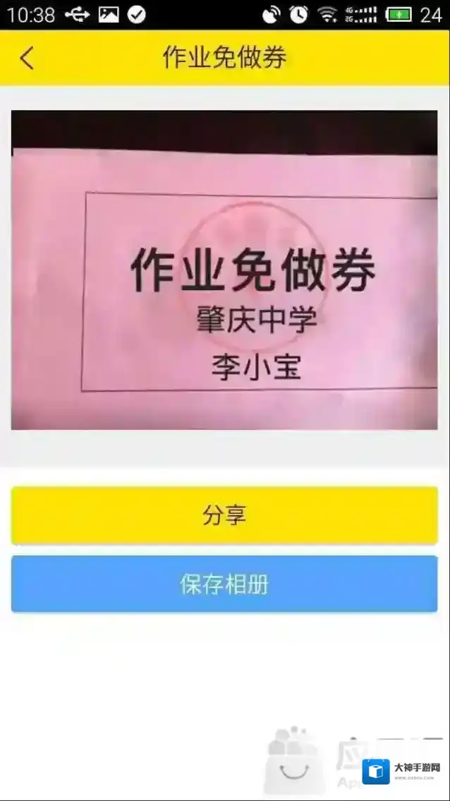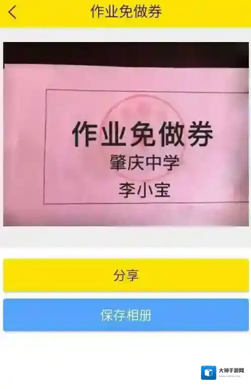 在“学校”恶搞页面下,你可以选择“开学寄语”、“装逼短信”、“作业免做券”、“代写寒假作业”等等,我觉得“作业免做券”这个就比较有趣。打开页面,输入名字,输入学校,就可以一键生成你想要的效果。