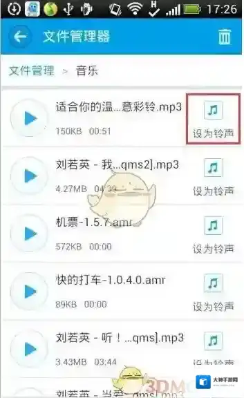 步骤四、如果您是下载的铃声,并且想设置为手机铃声的话,在手机上打开2345手机助手安卓版,进入“管理”– “音乐”,找到该铃声,点击“设为铃声”即可。
