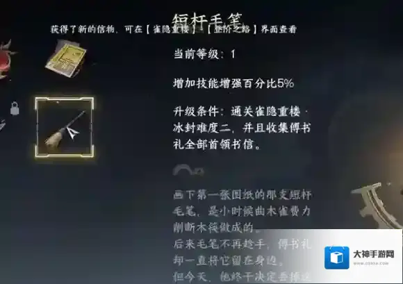 5、击败后,中间书桌上有一份崭新的信,点击阅读,即可获得短杆毛笔信物。