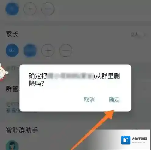 4、来到选择要删除的人页面,我们勾选需要删除的家长,然后点击确定即可;