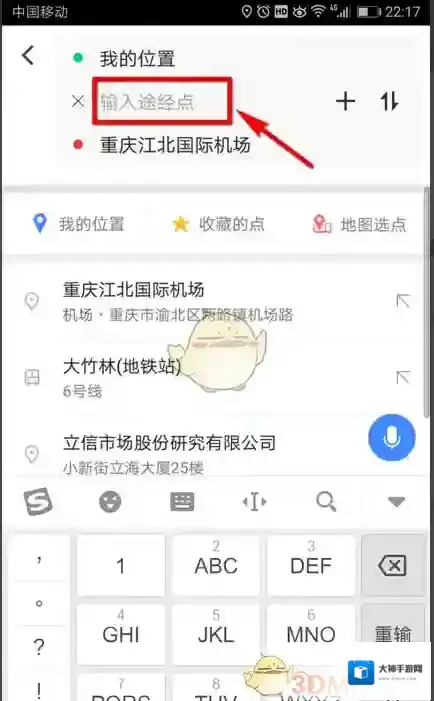 3、在输入框中输入目的地后,在页面下方的列表中会出现搜索结果,在搜索结果中点击选中的目的地。