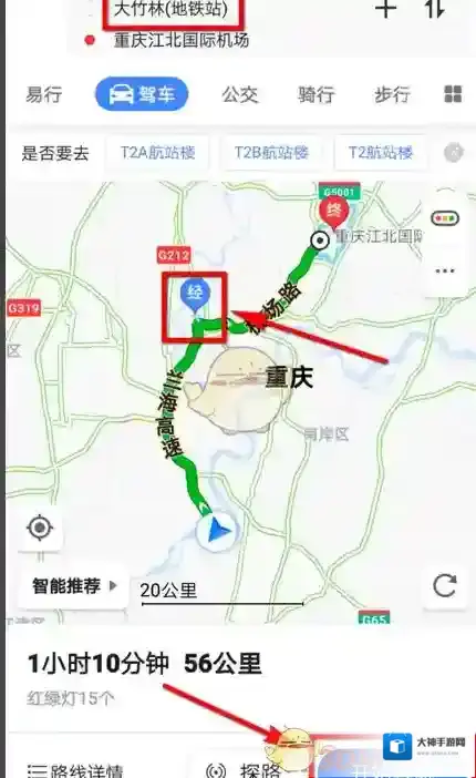 6、点击导航以后首先会出现路线的全程,路线中间某个位置有个经字,这个位置表示就是途经点。