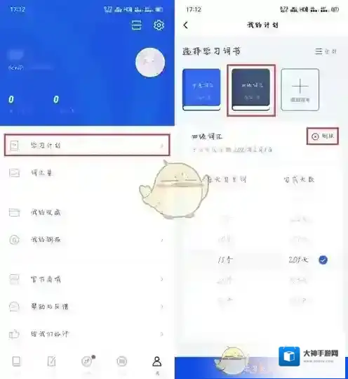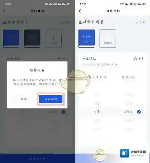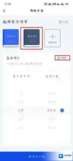 2、进入调整计划页面后,可以看到当前的学习计划学习的词书,如果需要删除,则要确保我们添加了两个或者两个以上的词书,只有一个词书无法删除;