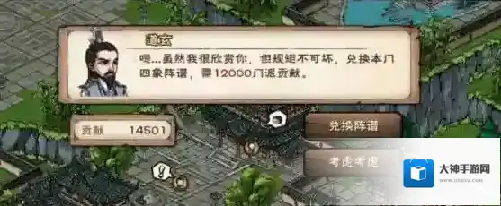 5、准确回答出问题后再选择请授阵法选项,花费12000门派贡献后就能获得四象阵法了。