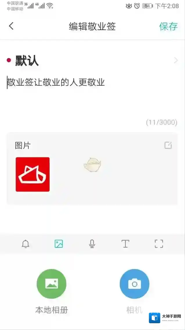 3、在编辑界面上点击底部的图片按钮,在弹出的操作选项中点击本地相册或是相机,即可开始上传图片;