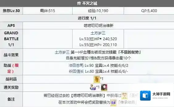 FGO明治维新复刻第二节配置攻略 主线本配置掉落介绍 更多内容点击:FGO唠唠叨叨明治维新复刻攻略 主线本第二节是明治维新复刻活动的第二个主线关卡。 需要消耗:AP*5 通关奖励: 关卡配置如下: 织田幕府胜利 新选组胜利 「信田门外之变」 敌方配置...2025-09-05 -