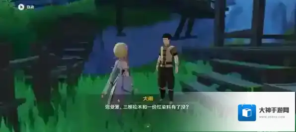 到达轻策庄找到路爷后与他对话,过剧情,剧情过后大雨让你找三根松木和一份红颜料交给他。