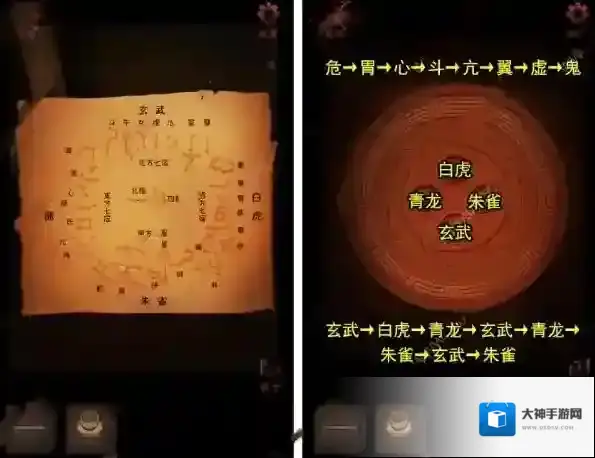 6、接着我们查看吊桥右侧圆盘,用星宿图线索,找到每个星宿名称对应神兽,依次点击即可。