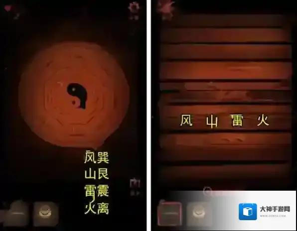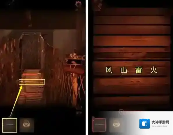 7、我们再把图案木条放进桥面凹槽,滑动木条使其对齐图案,获得线索:风山雷火。