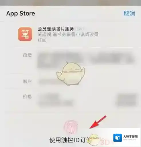4、根据下方“使用触控ID订阅”的提示完成指纹支付,即可开通会员。
