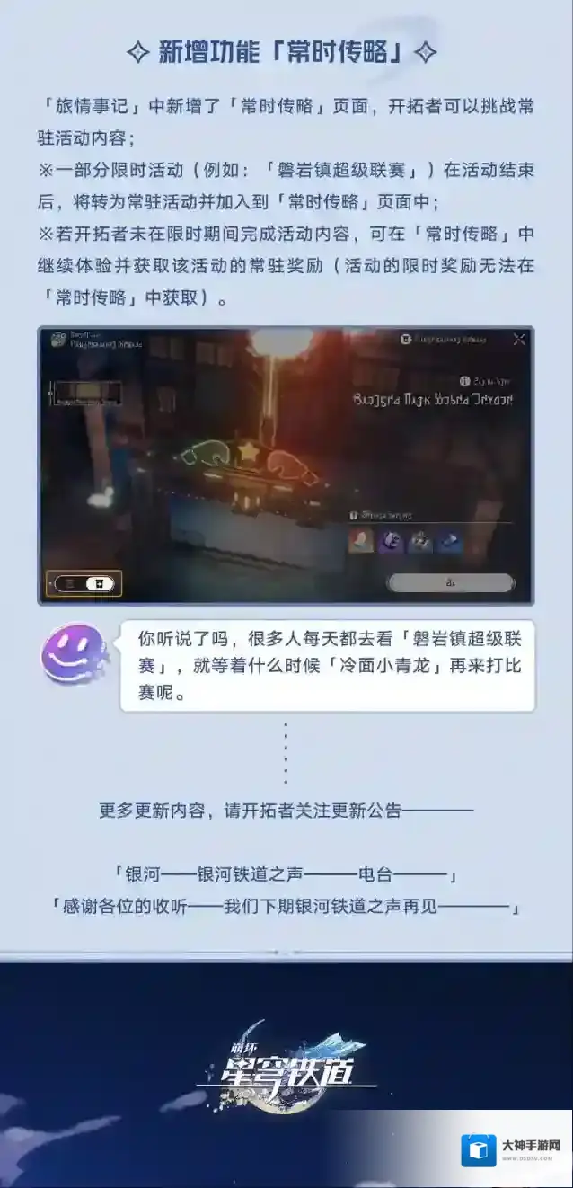 欢迎开拓者来到1.1版本「银河漫游」。本期银河铁道之声的主题是–更新电台!本期节目将会给开拓者介绍1.1版本中部分优化与新增功能。一起来看看吧~