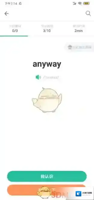 5、单词自评页面,根据英文提示回忆中文,点击我认识可快速刷词进入单词详情页,点击提示一下会出现例句提示,再次点击想起来了或没想起来进入单词详情页。
