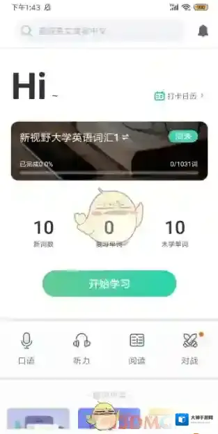 4、回到首页,就可以看到你选择的单词书以及设置的学习任务量,点击开始学习按钮既可开始背单词了。