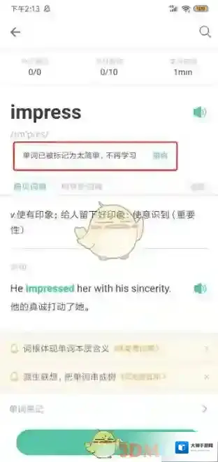 6、在单词自评页面点击右上角的太简单,则这个单词将被定义为简单词,不会在今后的学习中再次出现。