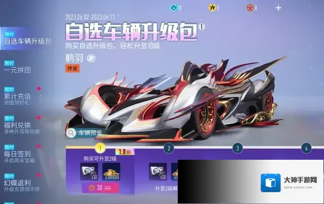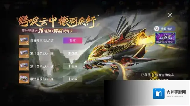 『登录送20抽+盲盒车抢先试驾』下载新版本内容,完成登录、分享任务即可获得鹤羽盲盒券20张+八级鹤羽试驾卡。盲盒神车,抢先试驾,不容错过!