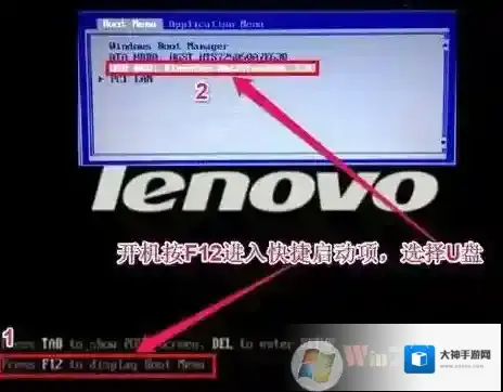 5、保存设置后自动重启进入LOGO画面时,一直按F12,选择U盘启动,如下图所示;