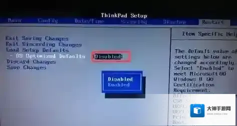 4、在Restart下,选择OS Optimized Defaults回车,改成Disabled或Other OS,接着选择Load Setup Defaults回车进行加载,然后按F10保存设置。