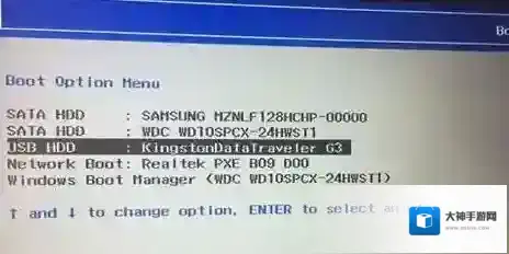 6、插入制作好的U盘启动盘,重启按F12或FN+F12调出启动管理对话框,选择USB HDD识别到U盘启动进入PE,回车进入PE,如下图所示