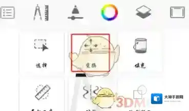 在SketchBook中,使用变形功能或变换工具非常简单。用户只需在画布上绘制好图形后,点击界面上方第二个图标即可选择变换功能,此时图形上会出现灰色的调整点。通过单指拖动可以调整图形的位置,双指操作则可以实现放大、缩小和旋转效果。