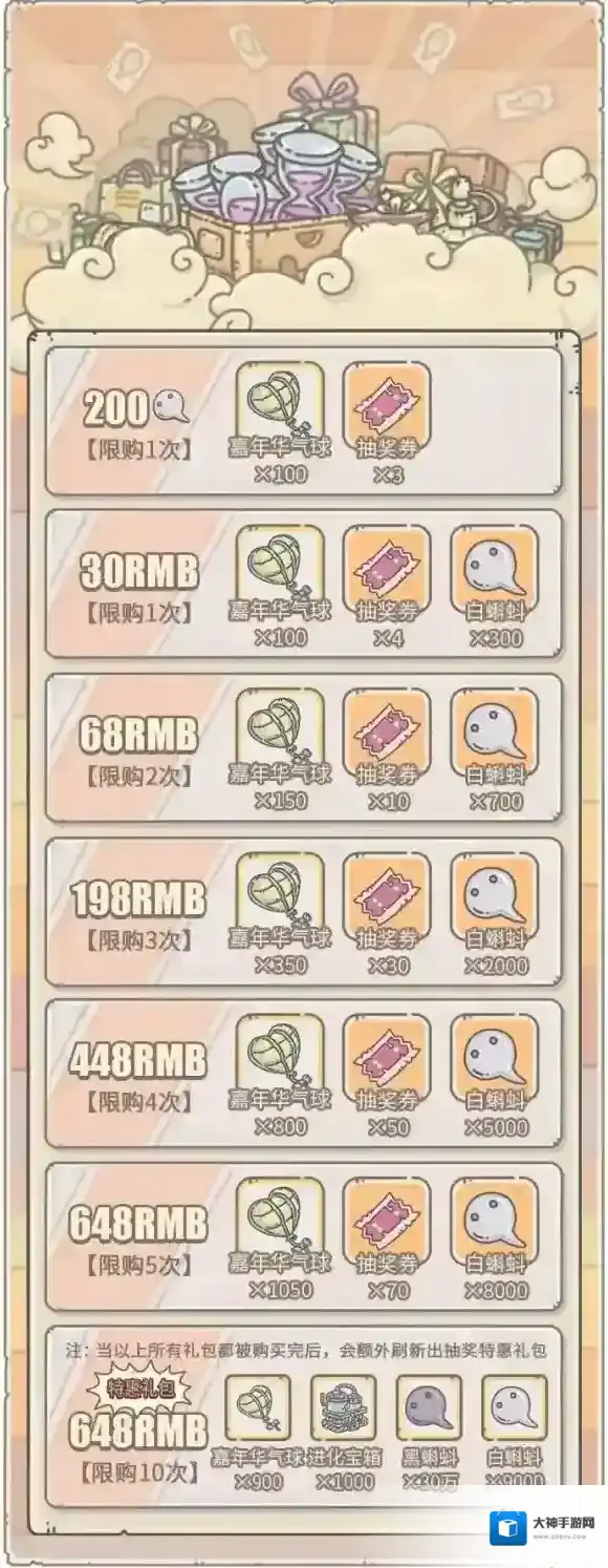 内容为:白蝌蚪×20、抽奖券×3、嘉年华气球×100