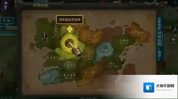 由于许多任务需要跑地图,点击右上角的的小地图就可以查看当前的位置,在地图里面有分为当前地图、世界地图和城战。在当前地图能够寻找NPC、怪物和传送点,点击名字就可以自动寻路,在世界地图上可以传送到不同的区域。