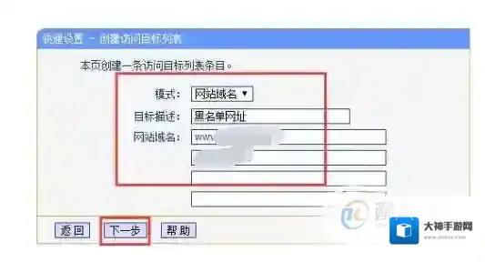 4、按照如图所示,选择网站域名模式,在网站域名中输入需要设置黑名单的网址,再点击下一步。