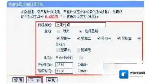 5、在创建日程计划页面,选择上班时间段,点击下一步,规则描述随便填写,其他默认不动,最后点击结束即可。