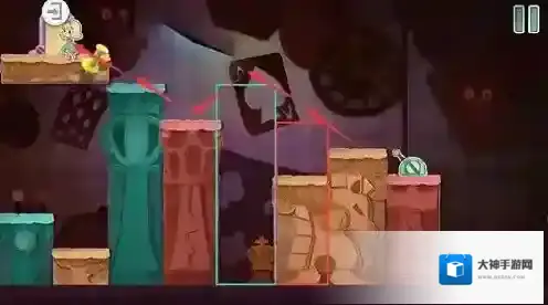 4.回头拉下拉杆,然后将青色方块往右移,用较矮的柱子铺路,移动到对面黄色方块上。