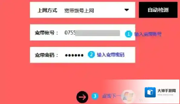 如果你的宽带符合上面介绍的情况,“上网方式”就应该选择:宽带账号– 然后填写“宽带帐号”、“宽带密码”– 点击“下一步”。