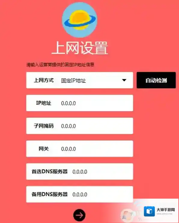 如果你的宽带符合上面介绍的情况,那么“上网方式”就应该选择:固定IP地址– 然后填写:IP地址、子网掩码、网关、DNS服务器地址– 点击“下一步”。