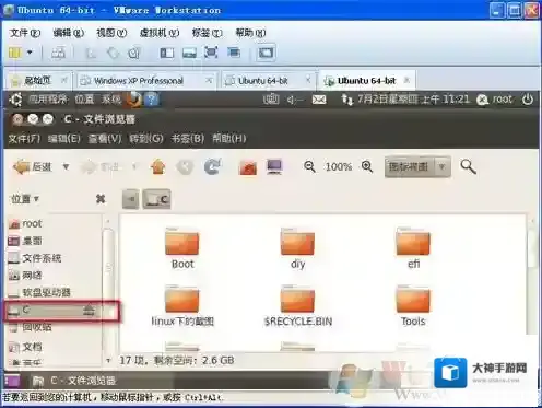 13、成功后打开vmware下的linux(uubuntu) :我的U盘显示 硬盘图标C