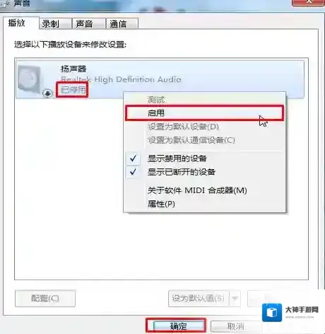 2、在播放设备选项框中,如果看见如图的设备停用,就右键选择启用