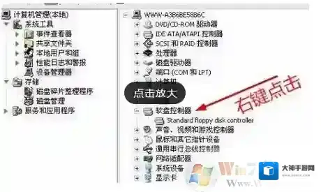 win7系统提示windows驱动器未就绪修复方法图五6、右键单击“软盘控制器”下的“standard floppy disk controller”。