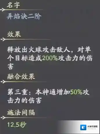 ● 技能介绍:释放出火球攻击敌人,对单个目标造成200%攻击力的伤害融合效果