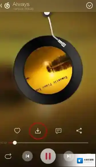 如果不着急,小伙伴们都会选择先试听一下,看是否对自己口味再决定下载。那么选择播放后,在播放界面,如果觉得好听,就可以点击“唱片”下四个选项中的第二个“下载”按钮啦!