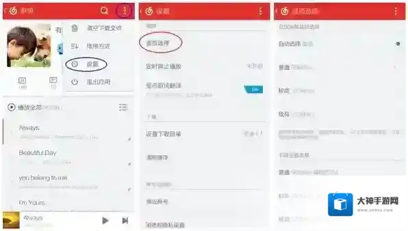 另外,前面说了,网易云音乐提供高品质的在线播放和下载,如果想在下载时自动下载高品质的,那么在网易云音乐的一级和二级页面的右上角的设置里便可以找到音质选择的设置。