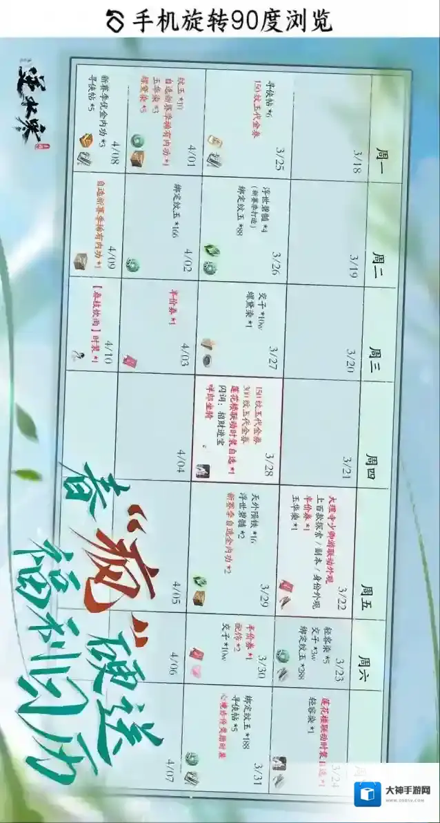 参与浮梦清晖签到活动,第四日(3月25日)、七日(3月28日)可领取150纹玉代金券;