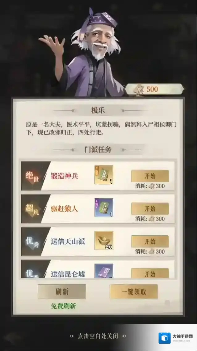 开始任务需要消耗一定的资源,任务时间结束后,便可领取门生帖门派贡献等任务奖励。