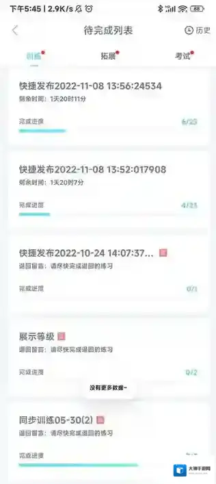 4、返回上一级点击右上角的历史,这里可以查看你做过的训练成绩和考试成绩;
