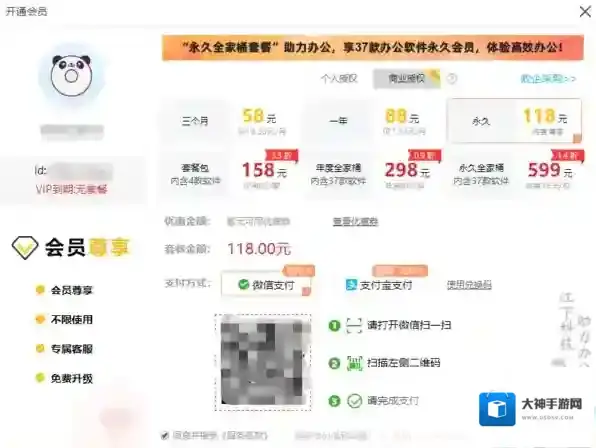 2、在这个页面里,可以看到有三个月、一年、永久和其他的套餐期限,使用微信或者支付宝扫码支付以后就可以解锁会员版功能了。
