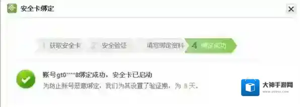 6、如果你的页面也像下图一样,提示安全卡绑定成功就说明我们已经将账号绑定好安全卡了,这样账号的安全等级就有了进一步的提升。