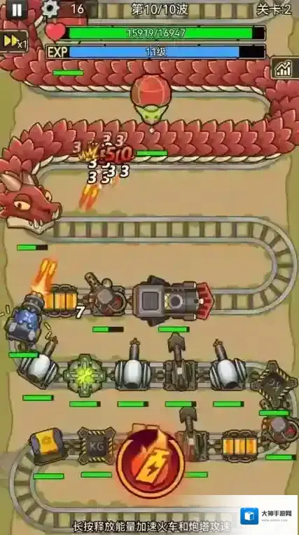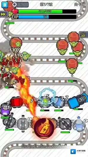 3、放好炮塔后点击开始战斗火车会自动前进,车厢上的炮塔也会自动攻击,点击屏幕中间的按钮可以加速火车和炮塔攻速。