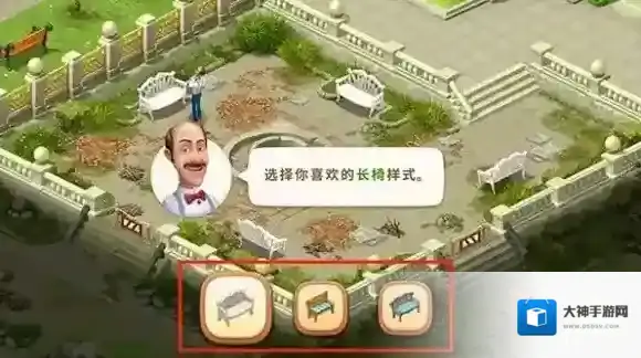 4、如图,提供了三种长椅可以选择,点击相应的长椅可以进行预览,选择好后点击右下角打勾图标即可确认,得到了管家的好评。