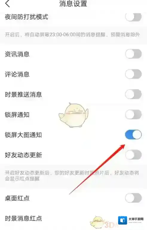 3、“消息设置”页面根据指引点击“锁屏大图通知”开关标识。如图所示: