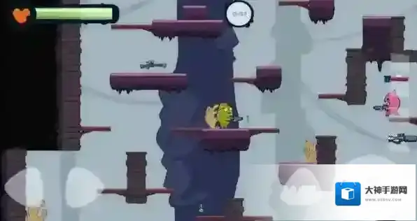 2、呈现横版闯关场景,有粉色火柴人角色、武器、关卡地形等元素,玩家操控角色在关卡中战斗、收集武器、闯关,画面含时间、血量条等界面信息。