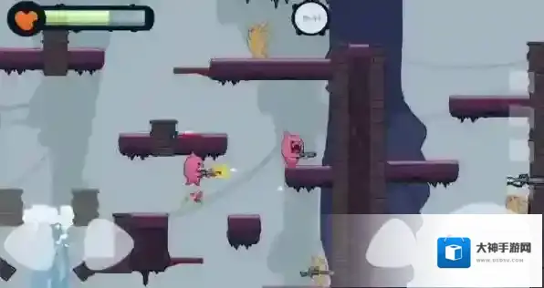 1、呈现横版闯关场景,有粉色、黄色等角色,角色持武器,画面含箭头指示、时间、血量条等元素,玩家操控角色战斗闯关。